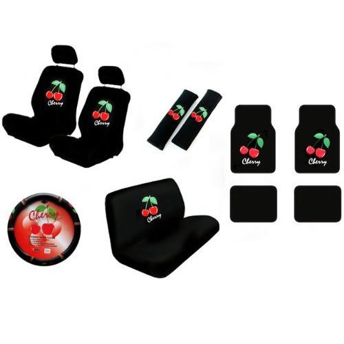 Love the sweet fruity cherry sensation? Bring the brightness of cherries to your car with the Cherry Auto Interior Gift Set! The Cherry Auto Interior Gift Set includes 1 steering wheel cover, 2 bucket seat covers (2 top and 2 bottom), 2 headrest covers, 1 bench seat cover (1 top and 1 bottom), and 2 seat belt shoulder pads. The simulated leather steering wheel cover provides a soft comfortable grip and fits most standard size steering wheels (14.5 - 15.5 inch.) The steering wheel cover also protects your steering wheel from cracking or peeling. The bucket seat covers are made from 100% Polyester material, and are designed to fit most high and low-backed bucket seats. It can be installed over or under the headrest on vehicles with removable headrests, and some vehicles with armrests may need to have them removed and reinstalled for a semi-custom fit. These front bucket seat covers come with elastic straps and hooks that will snug and secure it under the seat. The shoulder belt pads provide relief from the stress of the seat belts. The floor mats are heavy duty plush thick pile carpet floor mats with licensed graphic design. Embossed logo makes the design stand out! The backing is made from nipped PVC that prevents sliding and shifting. There is no better way to protect your vehicle's floor while having a bit of fun. The perfect gift for anyone that loves artistic designs and the cherry fruit! Fill your car with the bright and luscious Cherry Auto Interior Gift Set today! *WILL NOT FIT SEATS WITH ANY OF THE FOLLOWING: 1. INTEGRATED SEAT BELT. 2. SEATS WITH SIDE AIRBAG. 3. OVERSIZED SEAT (captain seat). 4. SEATS WITH ARMREST (captain seat).* **Note: The seat covers in this set will only fit cars that are passenger sized (compacts, coupes, sedans, etc.) The seat covers will not fit seats in SUVs or Trucks.**