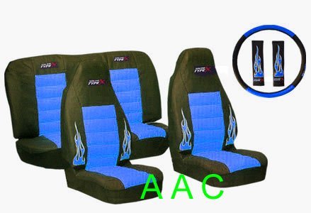 A Set of Universal-fit Type X Racing Style Front Bucket Seat Covers, Bench Seat Cover, Steering Wheel Cover and Shoulder Strap Cover - Blue Review