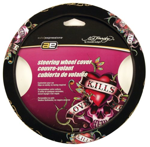 The Auto Expressions Steering Wheel Cover improves the appearance of old or dirty steering wheels and protects hands from hot and cold extremes. It installs easily by slipping right on and fits most standard steering wheels 14.5 inches – 15.5 inches in diameter. Coordinates with Ed Hardy By Christian Audigier Love Kills seat cover and floor mat.